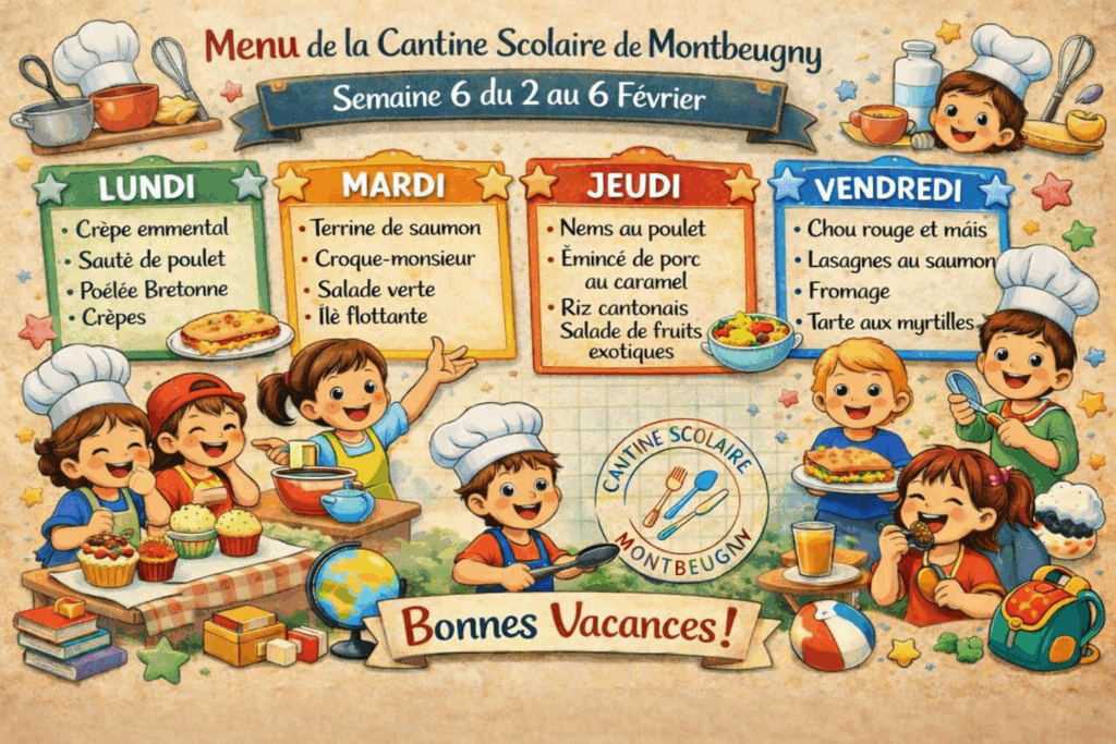 Cantine scolaire La cantine scolaire est gérée par une association autonome et bénévole de parents d’élèves.Les repas sont confectionnés par un agent communal, Mme BRAHIMI Samia.Tarif du repas : 3,00 € Les menus sont affichés tous les quinze jours sur la porte de la cantine ainsi que sur cette page internet. La vente des tickets a lieu du lundi au samedi de 9h à 11h45 en mairie.Le règlement intérieur de la cantine est consultable à l’entrée. Contact : 07.75.86.28.47 – cantine.montbeugny@gmail.com MENUS DE LA CANTINE SCOLAIRE Cantine scolaire Lire la suite »