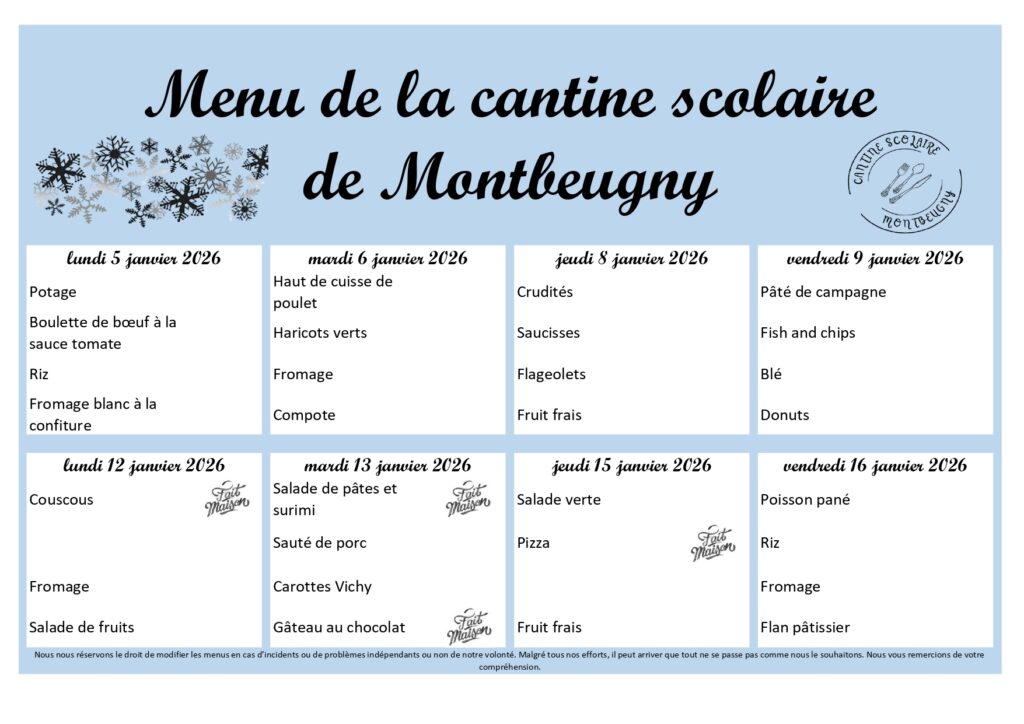 Cantine scolaire La cantine scolaire est gérée par une association autonome et bénévole de parents d’élèves.Les repas sont confectionnés par un agent communal, Mme BRAHIMI Samia.Tarif du repas : 3,00 € Les menus sont affichés tous les quinze jours sur la porte de la cantine ainsi que sur cette page internet. La vente des tickets a lieu du lundi au samedi de 9h à 11h45 en mairie.Le règlement intérieur de la cantine est consultable à l’entrée. Contact : 07.75.86.28.47 – cantine.montbeugny@gmail.com MENUS DE LA CANTINE SCOLAIRE Cantine scolaire Lire la suite »