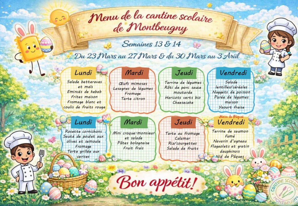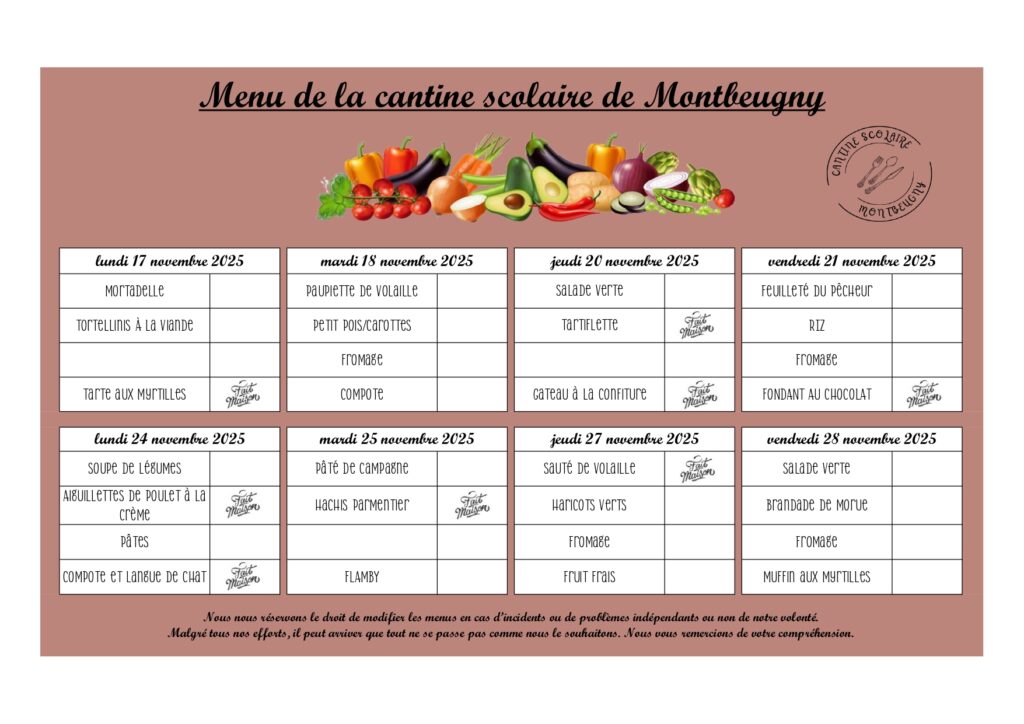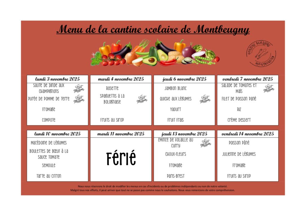 Cantine scolaire La cantine scolaire est gérée par une association autonome et bénévole de parents d’élèves.Les repas sont confectionnés par un agent communal, Mme BRAHIMI Samia.Tarif du repas : 3,00 € Les menus sont affichés tous les quinze jours sur la porte de la cantine ainsi que sur cette page internet. La vente des tickets a lieu du lundi au samedi de 9h à 11h45 en mairie.Le règlement intérieur de la cantine est consultable à l’entrée. Contact : 07.75.86.28.47 – cantine.montbeugny@gmail.com MENUS DE LA CANTINE SCOLAIRE Cantine scolaire Lire la suite »