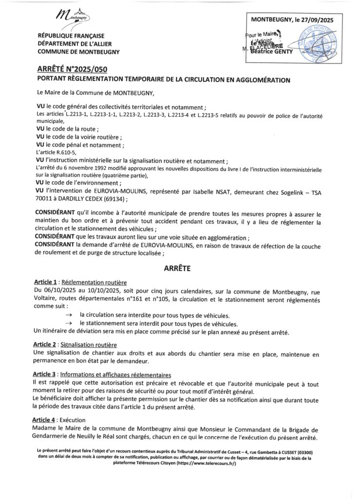Cette intervention, organisée par l’Unité Technique Territoriale de l’Allier, s’inscrit dans le cadre de l’entretien des routes départementales et sera réalisée par l’entreprise EUROVIA